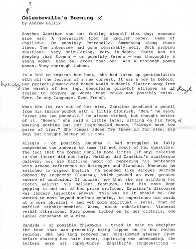 All the Latest Posted on February 22, 2011 by andrew gallix This is the original, incomplete, typescript of “Celesteville’s Burning” by yours truly: Share this: Click to share on X (Opens in new window) X Click to share on Facebook (Opens in new window) Facebook Click to share on Reddit (Opens in new window) Reddit Click to email a link to a friend (Opens in new window) Email Click to print (Opens in new window) Print Like Loading... Related