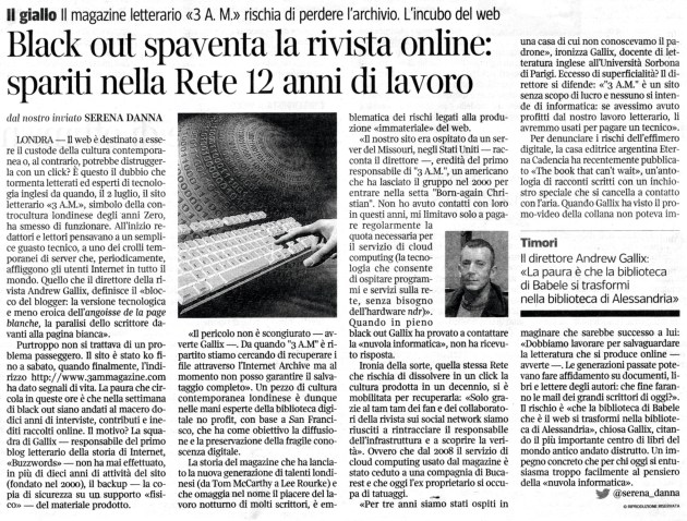 Yesterday, I was interviewed by Serena Dana for a piece on 3:AM Magazine‘s recent blackout. It features in today’s Corriere della Sera: