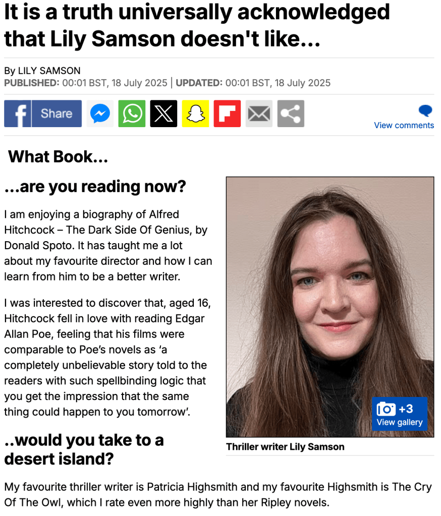 Watch Me Watch You Posted on July 18, 2025 by andrew gallix My portrait of Lily Samson is in the Daily Mail, 18th July 2025, both off- and online. Share this: Click to share on X (Opens in new window) X Click to share on Facebook (Opens in new window) Facebook Click to share on Reddit (Opens in new window) Reddit Click to email a link to a friend (Opens in new window) Email Click to print (Opens in new window) Print Like Loading... Related