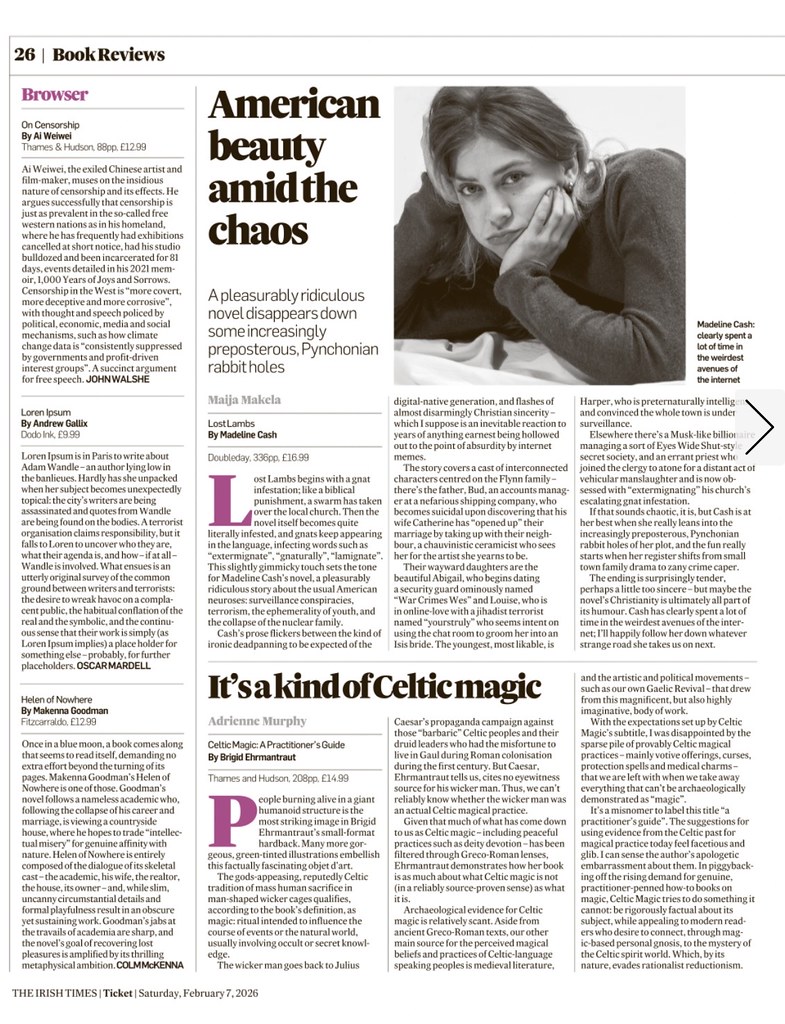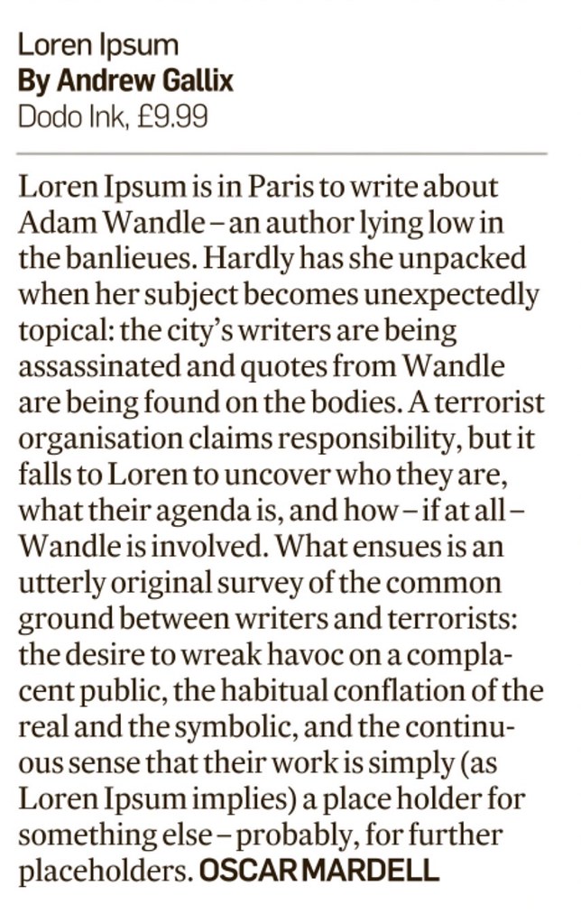 Utterly Original Posted on February 11, 2026 by andrew gallix Oscar Mardell‘s review of Loren Ipsum in the Irish Times, 7 February 2026, p. 26. Share this: Share on X (Opens in new window) X Share on Facebook (Opens in new window) Facebook Share on Reddit (Opens in new window) Reddit Email a link to a friend (Opens in new window) Email Print (Opens in new window) Print Like Loading... Related