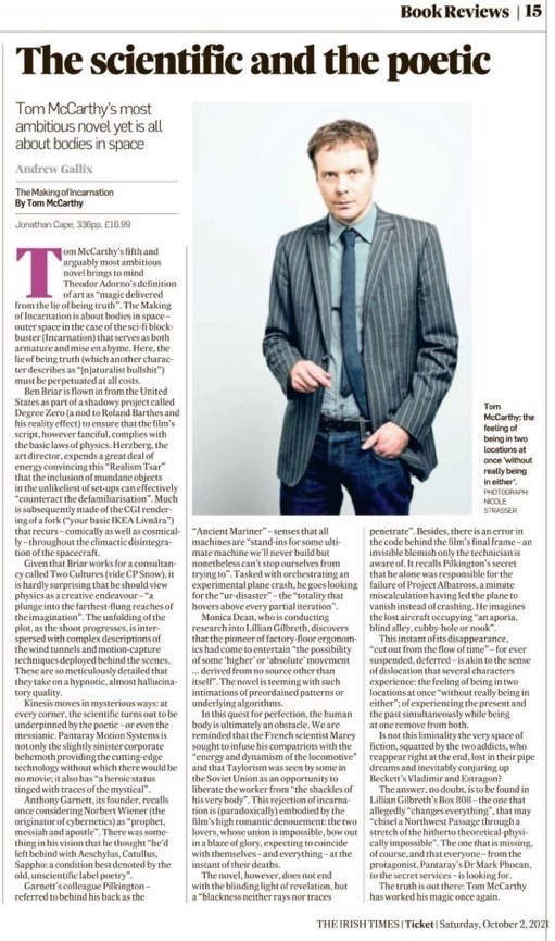Here is my review of The Making of Incarnation by Tom McCarthy. The Irish Times, 2 October 2021, p. 15: