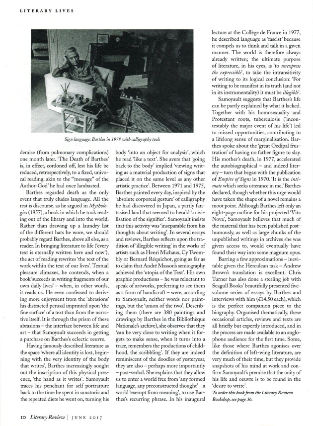 Barring a few approximations — inevitable given the Herculean task — Andrew Brown’s translation is excellent. Chris Turner has also done a sterling job with Seagull Books’ beautifully presented five-volume series of essays by Barthes and interviews with him (£14.50 each), which is the perfect companion piece to the biography. Organised thematically, these occasional articles, reviews and texts are all briefly but expertly introduced, and in the process are made available to an anglophone audience for the first time. Some, like those where Barthes agonises over the definition of left-wing literature, are very much of their time, but they provide snapshots of his mind at work and confirm Samoyault’s premise that the unity of his life and oeuvre is to be found in the ‘desire to write’.