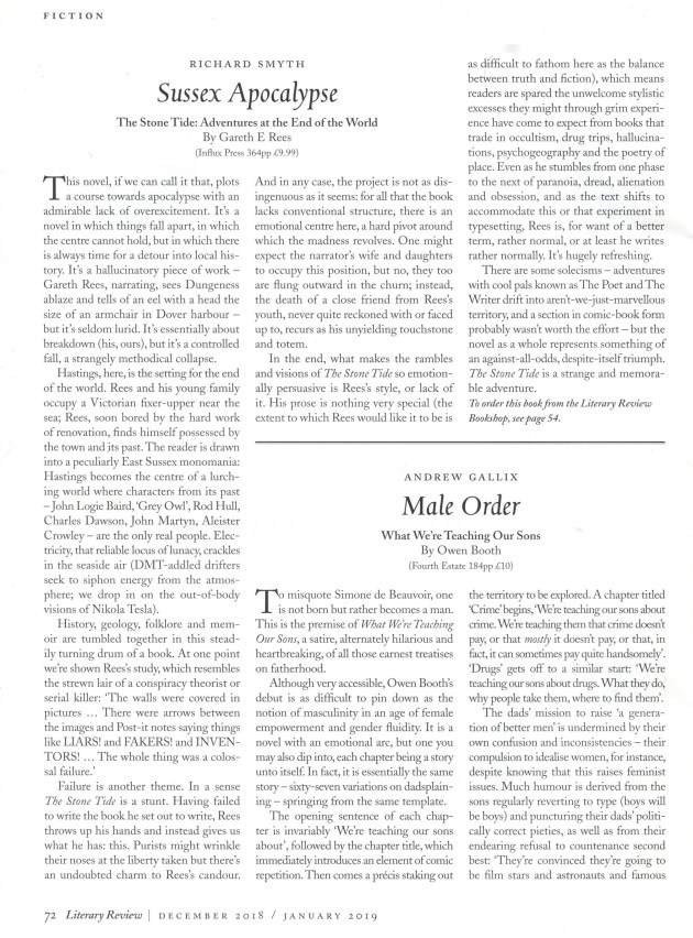 “Male Order.” Review of What We’re Teaching Our Children by Owen Booth. Literary Review, December 2018, pp. 72-73: