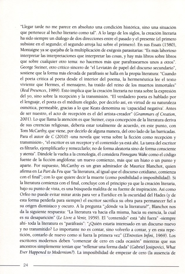 Según Bloom, este sentimiento de inferioridad es, más que un fenómeno característico del Renacimiento, el motor principal de la historia de la literatura: “Llegar tarde no me parece en absoluto una condición histórica, sino una situación que pertenece al hecho literario como tal”. A lo largo de los siglos, la creación literaria ha sido siempre un diálogo de dos direcciones entre el pasado y el presente (el primero subsiste en el segundo; el segundo arroja luz sobre el primero). En sus Essais (1580), Montaigne ya se quejaba de la multiplicación de exégesis parasitarias: “Es más laborioso interpretar las interpretaciones que interpretar las cosas, y hay más libros sobre libros que sobre cualquier otro tema: no hacemos más que parafrasearnos unos a otros”. George Steiner, otro crítico sincero de “el Leviatán de papel del discurso secundario”, sostiene que la forma más elevada de paráfrasis se halla en la propia literatura: “Cuando el poeta critica al poeta desde el interior del poema, la hermenéutica lee el texto viviente que Hermes, el mensajero, ha traído del reino de los muertos inmortales” (Real Presences, 1989). Esto implica que la creación literaria no trata sobre la expresión del yo, sino sobre la recepción y la transmisión. “El verdadero poeta es hablado por el lenguaje, el poeta es el médium elegido, por decirlo así, en virtud de su naturaleza osmótica, permeable, gracias a lo que Keats denomina su ‘capacidad negativa’. Antes de ser nuestro, el acto de recepción es el del artista-creador” (Grammars of Creation, 2001). Lo que llama la atención es que Steiner, cuya concepción de la literatura deriva de sus creencias religiosas, debería estar totalmente de acuerdo, en este punto, con Tom McCarthy, que viene, por decirlo de alguna manera, del otro lado de las barricadas. Para el autor de C (2010) -una novela que versa sobre la ficción como recepción y transmisión-, “el escritor es un receptor y el contenido ya está ahí. La tarea del escritor es filtrarlo, ejemplificarlo y remezclarlo; no de forma aleatoria sino de forma consciente y atenta”. Dándole la vuelta a la cronología, él considera Finnegans Wake como el código fuente de la ficción anglófona: un nuevo comienzo, más que un hiato o un punto y aparte. Por supuesto, McCarthy es un gran admirador de Maurice Blanchot, quien afirma en La Part du Feu que “la literatura, al igual que el discurso cotidiano, comienza con el final”; con lo que quiere decir la muerte (como posibilidad o imposibilidad). Si la literatura comienza con el final, concluye con el principio ya que la creación literaria, bajo su punto de vista, es una búsqueda maldita de su fuente de inspiración. Así como Orfeo no puede evitar mirar atrás para ver a Eurídice en la oscuridad del Hades (y de esta forma perderla para siempre) el escritor sacrifica su obra para permanecer fiel a su origen dionisíaco y oscuro. A la pregunta “¿dónde va la literatura?”, Blanchot nos da la siguiente respuesta: “La literatura va hacia ella misma, hacia su esencia, la cual es su desaparición” (Le Livre à Venir, 1959). El “contenido” está “ahí fuera” -siempre ahí- toda la literatura es “paráfrasis”: “¿Quién estaría interesado en un discurso nuevo y no transmitido? Lo importante no es contar, sino volverlo a contar, y en esta repetición, contarlo de nuevo como si fuera la primera vez” (L’Entretien Infini, 1969). Los escritores modernos deben “comenzar de cero en cada ocasión” mientras que sus ancestros simplemente tenían que “rellenar una forma dada” (Gabriel Josipovici, What Ever Happened to Modernism?). La imposibilidad de empezar de cero (la ausencia de una “primera vez” definitiva) significa que la literatura fracasa al comenzar una y otra vez, como si se tratara de una compulsiva repetición inducida de forma traumática. En otras palabras, no cesa de acabar. La novela, dice Tom McCarthy, ha estado “viviendo su propia muerte” desde Don Quijote; la “experiencia del fracaso” es parte integral de su ADN. Si no estuviera muriendo, no estaría viva.