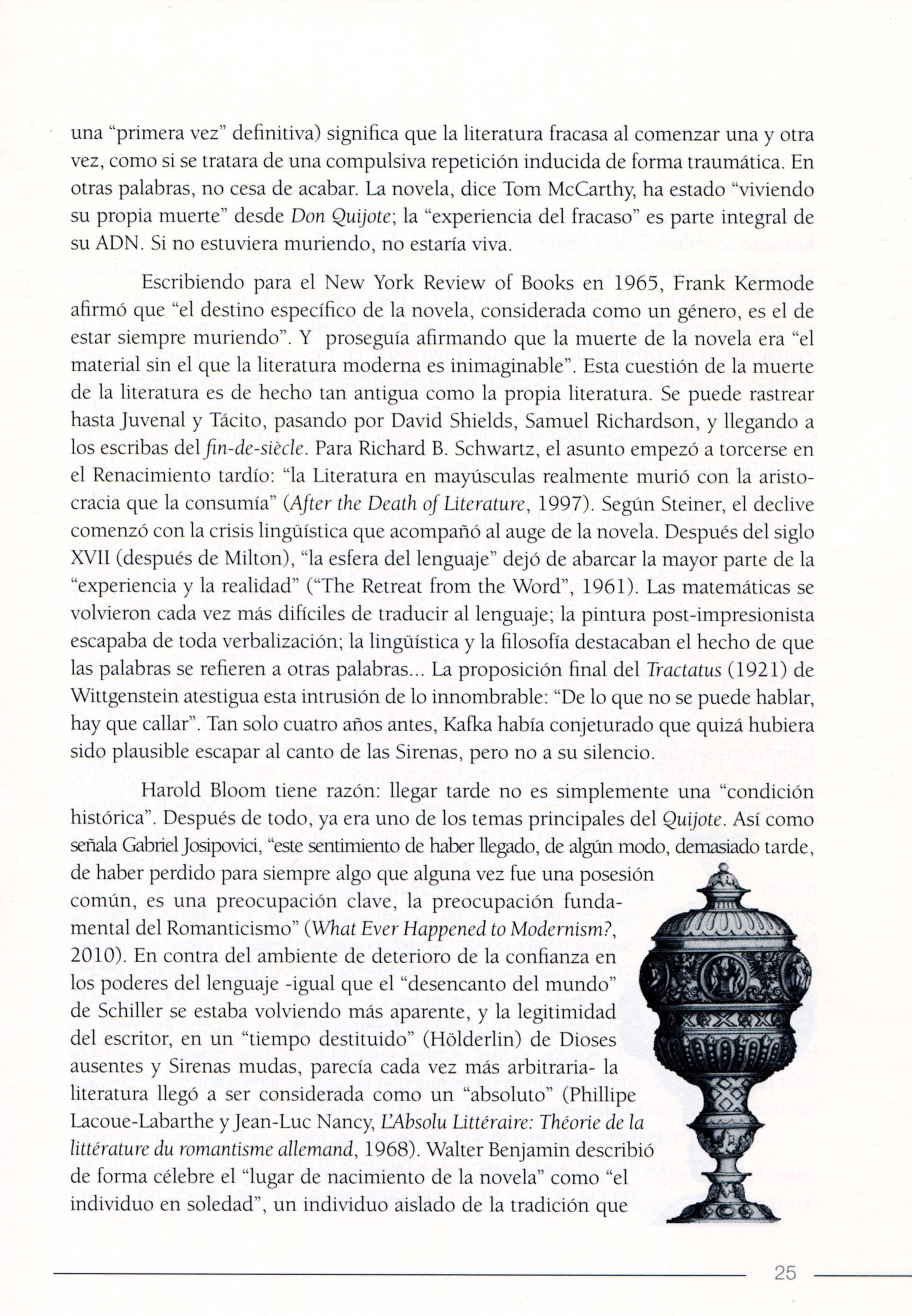 Harold Bloom tiene razón: llegar tarde no es simplemente una “condición histórica”. Después de todo, ya era uno de los temas principales del Quijote. Así como señala Gabriel Josipovici, “este sentimiento de haber llegado, de algún modo, demasiado tarde, de haber perdido para siempre algo que alguna vez fue una posesión común, es una preocupación clave, la preocupación fundamental del Romanticismo” (What Ever Happened to Modernism?, 2010). En contra del ambiente de deterioro de la confianza en los poderes del lenguaje -igual que el “desencanto del mundo” de Schiller se estaba volviendo más aparente, y la legitimidad del escritor, en un “tiempo destituido” (Hölderlin) de Dioses ausentes y Sirenas mudas, parecía cada vez más arbitraria- la literatura llegó a ser considerada como un “absoluto” (Phillipe Lacoue-Labarthe y Jean-Luc Nancy, L’Absolu Littéraire : Théorie de la littérature du romantisme allemand, 1968). Walter Benjamin describió de forma célebre el “lugar de nacimiento de la novela” como “el individuo en soledad”, un individuo aislado de la tradición que no puede reclamar ser el portavoz de la religión o la sociedad. Tan pronto como este “individuo en soledad” se elevaba al estatus de un alter deus, la tardanza esencial a toda la creatividad humana resultaba obvia. “Ninguna forma artística”, dice Steiner en Grammars of Creation (2001), “nace de la nada. Siempre viene después” y el “creador humano se enfurece ante [este] venir después, al ser, para siempre, segundo con respecto al misterio original y originador de la formación de la forma” (Real Presences, 1990). William Marx ha analizado con gran maestría cómo en Francia las desmedidas reivindicaciones para la literatura condujeron a esta decadencia prolongada. Esta evolución, de lo sublime a lo ridículo, tuvo lugar en tres etapas. A finales del siglo XVIII, la literatura se transformó en un sucedáneo de la religión. En una segunda etapa, marcada por la arrogancia, los escritores intentaron aislarse del resto de la sociedad (el arte por el arte) desencadenando de este modo un proceso de marginalización. En una última fase, la devaluación de la literatura (a los ojos del público en general) fue interiorizada por los propios escritores e incorporada a sus obras (L’Adieu à la Littérature. Histoire d’une dévalorisation XVIIIe-XXe siècles, 2005).