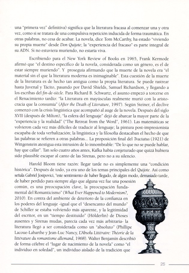 Escribiendo para el New York Review of Books en 1965, Frank Kermode afirmó que “el destino específico de la novela, considerada como un género, es el de estar siempre muriendo”. Y proseguía afirmando que la muerte de la novela era “el material sin el que la literatura moderna es inimaginable”. Esta cuestión de la muerte de la literatura es de hecho tan antigua como la propia literatura. Se puede rastrear hasta Juvenal y Tácito, pasando por David Shields, Samuel Richardson, y llegando a los escribas del fin-de-siècle. Para Richard B. Schwartz, el asunto empezó a torcerse en el Renacimiento tardío: “la Literatura en mayúsculas realmente murió con la aristocracia que la consumía” (After the Death of Literature, 1997). Según Steiner, el declive comenzó con la crisis lingüística que acompañó al auge de la novela. Después del siglo XVII (después de Milton), “la esfera del lenguaje” dejó de abarcar la mayor parte de la “experiencia y la realidad” (“The Retreat from the Word”, 1961). Las matemáticas se volvieron cada vez más difíciles de traducir al lenguaje; la pintura post-impresionista escapaba de toda verbalización; la lingüística y la filosofía destacaban el hecho de que las palabras se refieren a otras palabras… La proposición final del Tractatus (1921) de Wittgenstein atestigua esta intrusión de lo innombrable: “De lo que no se puede hablar, hay que callar”. Tan solo cuatro años antes, Kafka había conjeturado que quizá hubiera sido plausible escapar al canto de las Sirenas, pero no a su silencio.