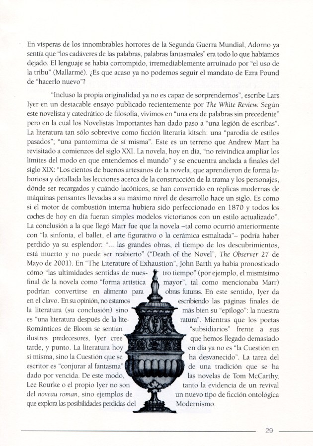 “Incluso la propia originalidad ya no es capaz de sorprendernos”, escribe Lars Iyer en un destacable ensayo publicado recientemente por The White Review. Según este novelista y catedrático de filosofía, vivimos en “una era de palabras sin precedente” pero en la cual los Novelistas Importantes han dado paso a “una legión de escribas”. La literatura tan sólo sobrevive como ficción literaria kitsch: una “parodia de estilos pasados”; “una pantomima de sí misma”. Este es un terreno que Andrew Marr ha revisitado a comienzos del siglo XXI. La novela, hoy en día, “no reivindica ampliar los límites del modo en que entendemos el mundo” y se encuentra anclada a finales del siglo XIX: “Los cientos de buenos artesanos de la novela, que aprendieron de forma laboriosa y detallada las lecciones acerca de la construcción de la trama y los personajes, dónde ser recargados y cuándo lacónicos, se han convertido en réplicas modernas de máquinas pensantes llevadas a su máximo nivel de desarrollo hace un siglo. Es como si el motor de combustión interna hubiera sido perfeccionado en 1870 y todos los coches de hoy en día fueran simples modelos victorianos con un estilo actualizado”. La conclusión a la que llegó Marr fue que la novela –tal como ocurrió anteriormente con “la sinfonía, el ballet, el arte figurativo o la cerámica esmaltada”– podría haber perdido ya su esplendor: “… las grandes obras, el tiempo de los descubrimientos, está muerto y no puede ser reabierto” (“Death of the Novel”, The Observer 27 de Mayo de 2001). En “The Literature of Exhaustion”, John Barth ya había pronosticado cómo “las ultimidades sentidas de nues- tro tiempo” (por ejemplo, el mismísimo final de la novela como “forma artística mayor”, tal como mencionaba Marr) podrían convertirse en alimento para obras futuras. En este sentido, Iyer da en el clavo. En su opinión, no estamos escribiendo las páginas finales de la literatura (su conclusión) sino más bien su “epílogo”: la nuestra es “una literatura después de la literatura”. Mientras que los poetas Románticos de Bloom se sentían “subsidiarios” frente a sus ilustres predecesores, Iyer cree que hemos llegado demasiado tarde, y punto. La literatura hoy en día ya no es “la Cuestión en sí misma, sino la Cuestión que se ha desvanecido”. La tarea del escritor es “conjurar al fantasma” de una tradición que se ha dado por vencida. De este modo, las novelas de Tom McCarthy, Lee Rourke o el propio Iyer no son tanto la evidencia de un revival del nouveau roman, sino ejemplos de un nuevo tipo de ficción ontológica que explora las posibilidades perdidas del Modernismo.