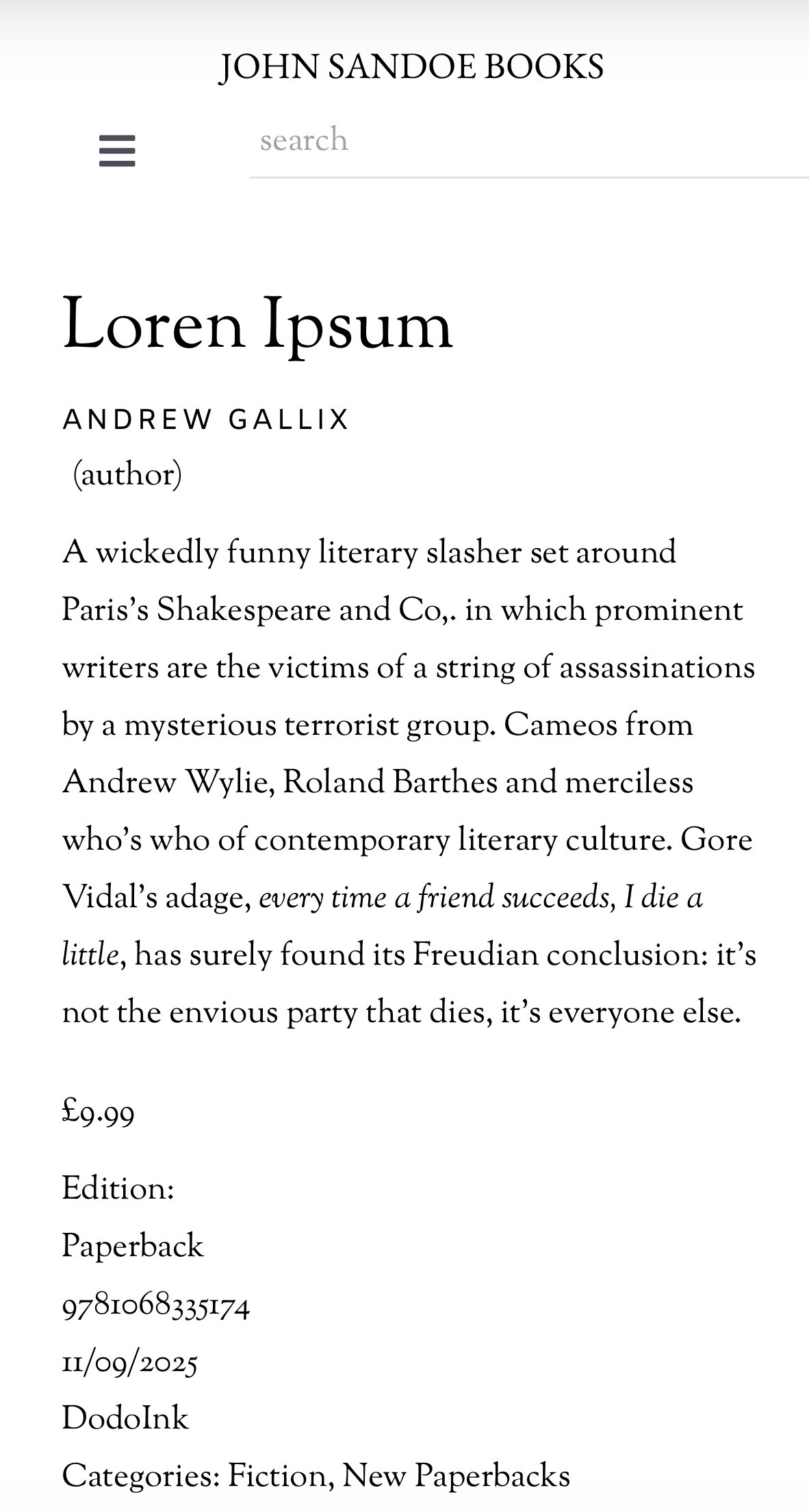 “Word for word, pun for pun, and twist for twist, Loren Ipsum is the most inventive and entertaining novel I’ve read in years. This is writing and plotting with a deep sense of freedom and mischief, and God we need more of both”.