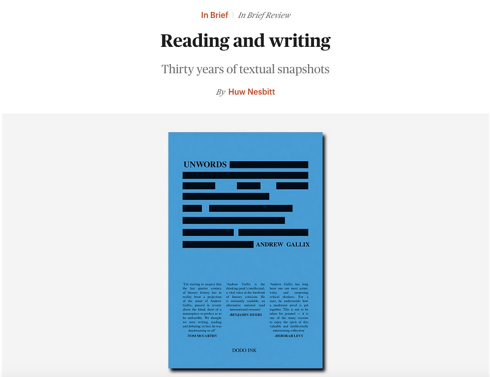 Nesbitt, Huw. “Reading and Writing: Thirty Years of Textual Snapshots.” Review of Unwords by Andrew Gallix, Times Literary Supplement, 14 June 2024, p. 25
