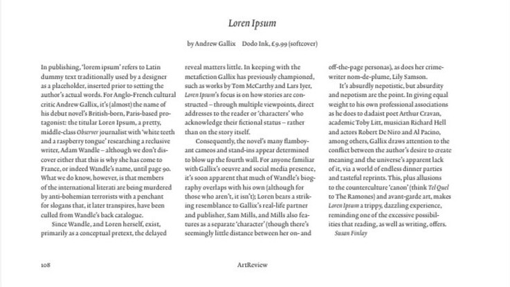 Jude Cook. “Vanity Fair.” Review of Loren Ipsum by Andrew Gallix, The Guardian, 15 November 2025.
