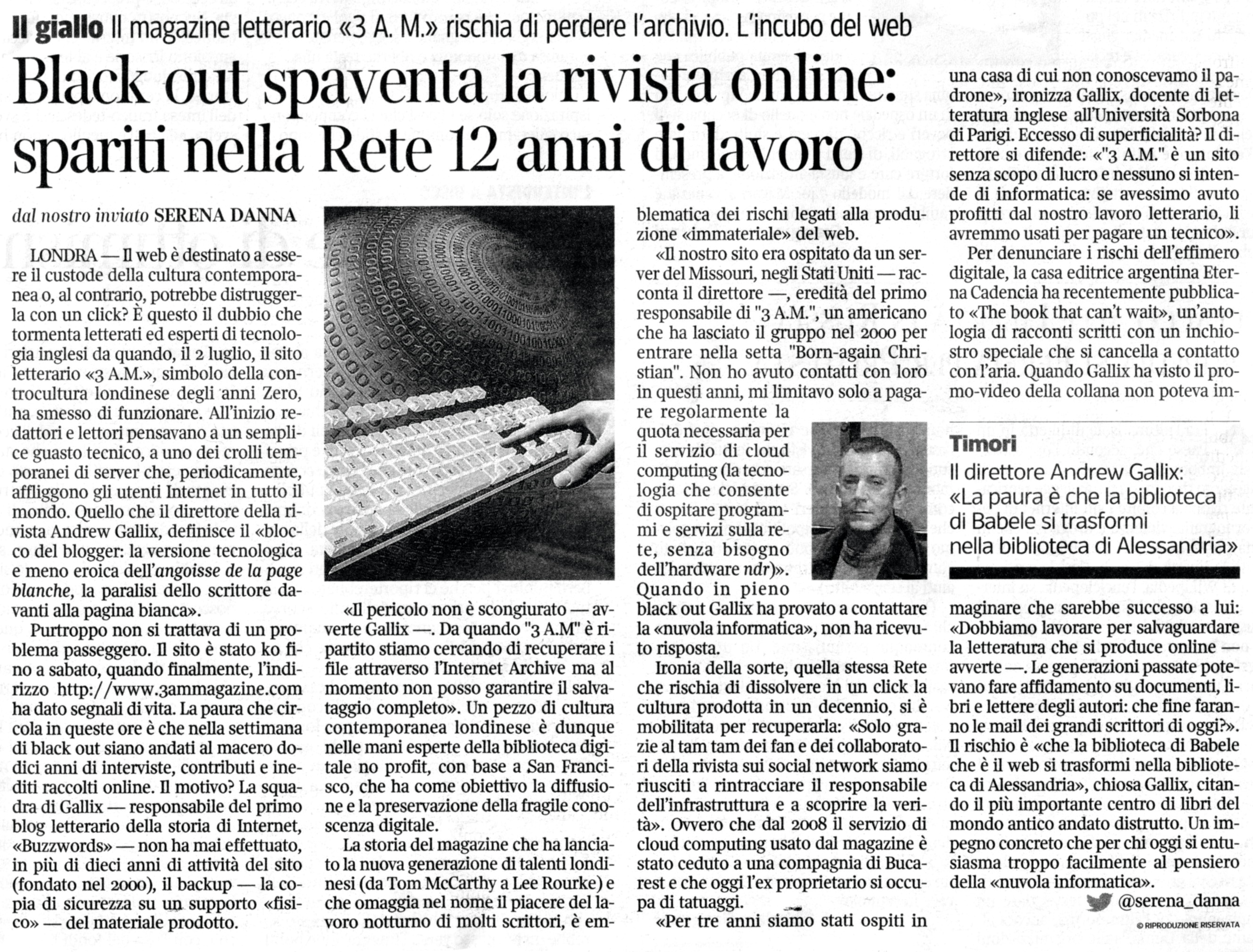 “[…] il sito letterario 3:AM, simbolo della controcultura londinese degli anni Zero […] il direttore della rivista Andrew Gallix, definisce il “bloco del blogger: la versione tecnologica e meno eroica dell’angoisse de la page blanche, la paralisi dello scrittore davanti alla pagina bianca”. […] La squadra di Gallix — responsabile del primo blog letterario di Internet, “Buzzwords” […] La storia del magazine che ha lanciato la nuova generazione di talenti londinesi (da Tom McCarthy a Lee Rourke) e che omaggia nel nome il piacere del lavoro notturno di molti scrittori, è emblematica dei rischi legati alla produzione “immateriale” del web. […] “Per tre anni siamo stati ospiti in una casa di cui non conoscevamo il padrone”, ironizza Gallix, docente di letteratura inglese all’Università Sorbona di Parigi. Eccesso di superficialità? Il direttore si difende: “3:AM è un sito senza scopo di lucro e nessuno si intende di informatica: se avessimo avuto profitti dal nostro lavoro letterario, li avremmo usati per pagare un tecnico”. […] Quando Gallix ha visto il promo-video della collana non poteva imaginare che sarebbe successo a lui: “Dobbiamo lavorare per salvaguardare la letteratura che si produce online — avverte —. Le generazioni passate potevano fare affidamento su documenti, libri e lettere degli autori: che fine farano le mail dei grandi scrittori di oggi?”. Il rischio è “che la biblioteca di Babele che è il web si transformi nella biblioteca di Alessandria”, chiosa Gallix, citando il più importante centro di libri del mondo antico andato distrutto […]”