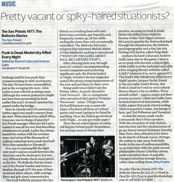 Empire, Kitty. “Pretty Vacant Or Spiky-Haired Situationists?” The Observer (The New Review section), 19 November 2017, p. 36.