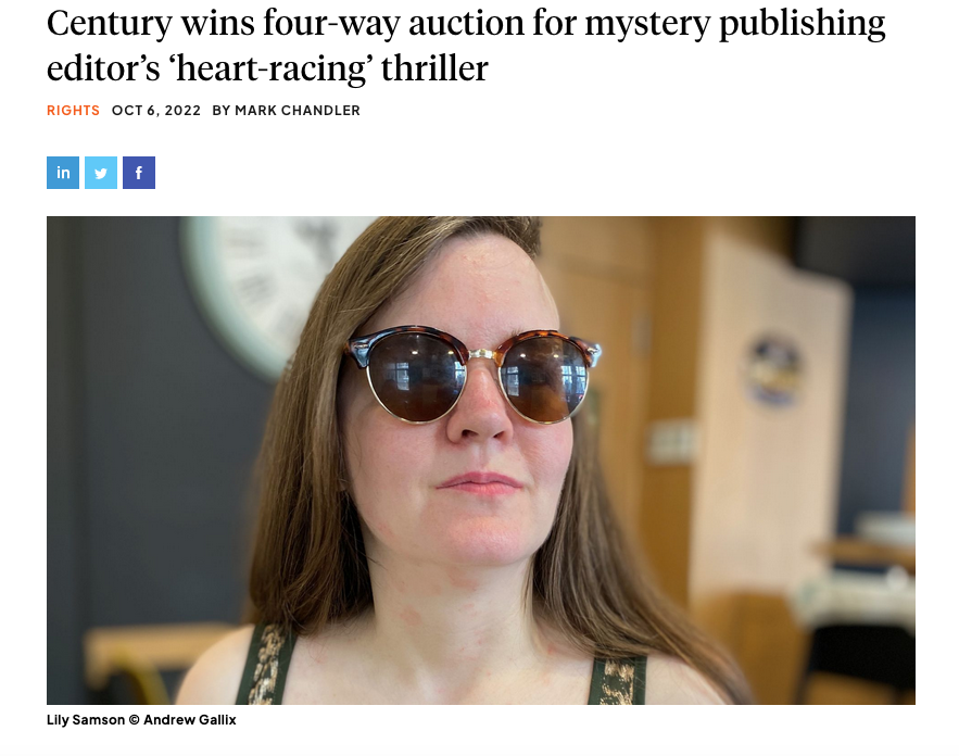 Delighted that my author pic of Lily Samson should feature in The Bookseller.