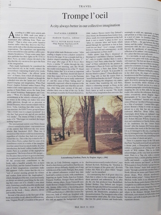 . . . In a fine introduction, the book’s editor Andrew Gallix claims Paris as a product of the anglophone imagination, ‘the locus of an art-life merger. . . It is the place that you have to go to to become, be recognised as, and lead the life of a writer”. . . . Gallix claims that the city is a “sort of neutral meeting ground for writers and readers from across the Anglosphere”, which, though possibly true, is not necessarily or always an entirely good thing for the writing that comes out of it. (Gallix’s own short story, featuring a cruelly plausible intellectual called Sostène Zanzibar, is one of the best pieces in the book — funny, allusive, clever and terribly French). . . .