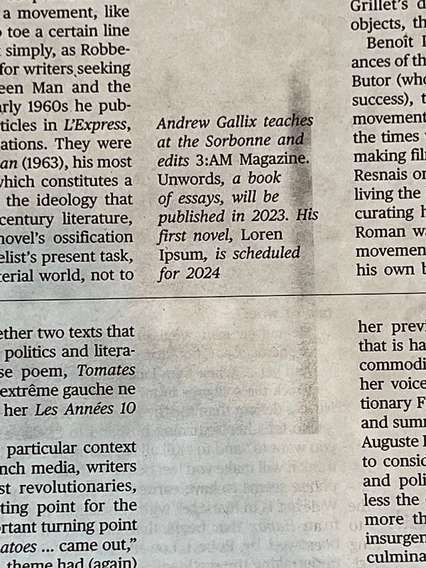 Nesbitt, Huw. “Reading and Writing: Thirty Years of Textual Snapshots.” Review of Unwords by Andrew Gallix, Times Literary Supplement, 14 June 2024, p. 25